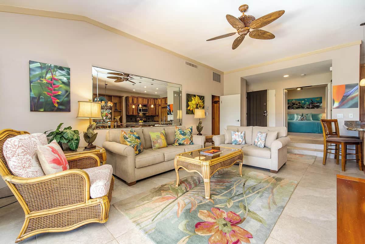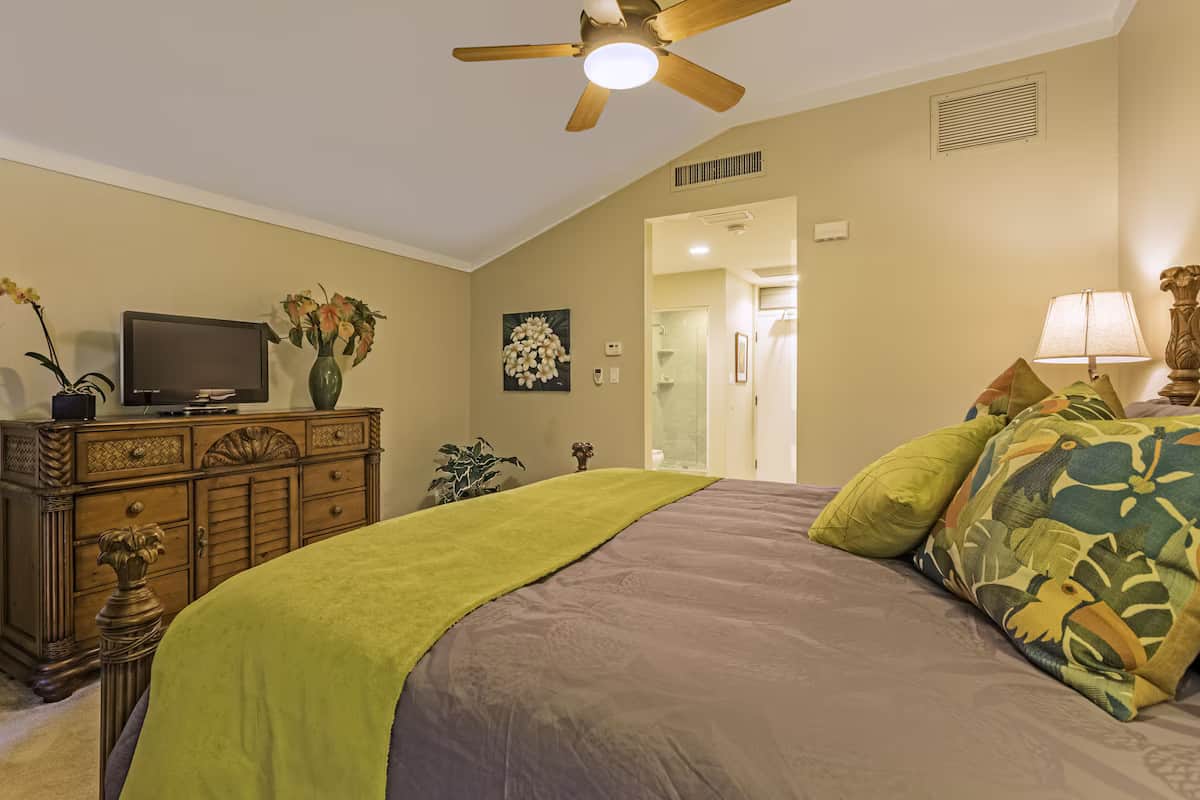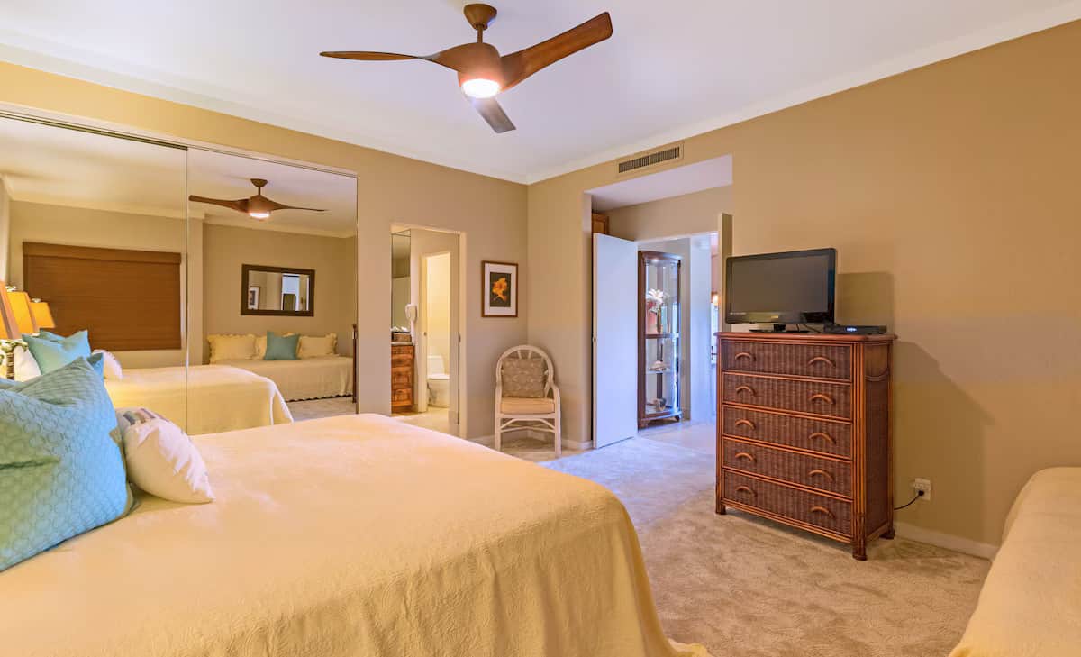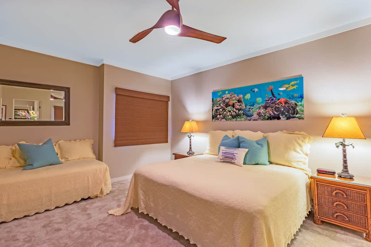The master suite features a plush king bed and its own private lanai. The second bedroom is flexible, offering two twin beds that can be converted into a king.