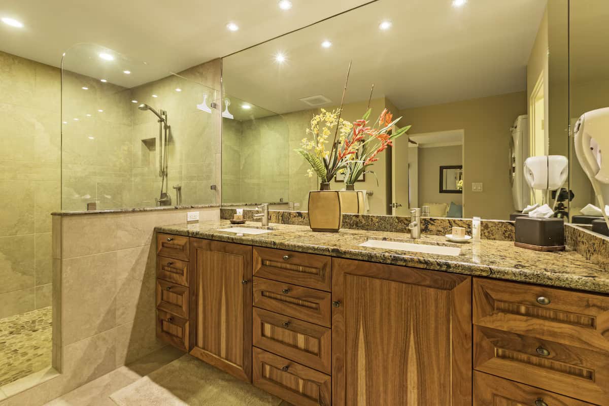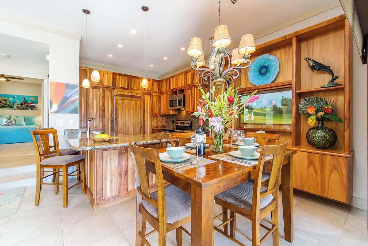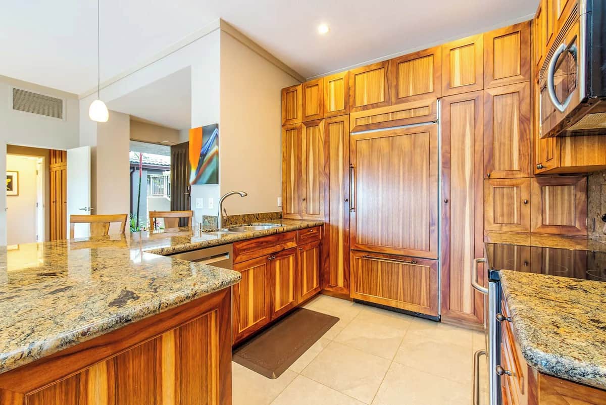 Step inside to find a beautifully appointed living space with custom Koa wood cabinets, granite countertops, and cool porcelain floors.
